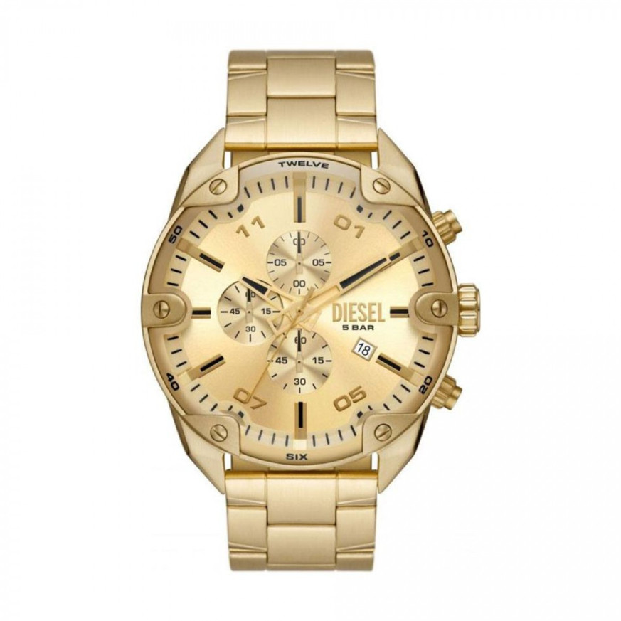 Diesel DZ4608 от колекция Spiked e мъжки кварцов часовник със златист кръгъл циферблат, златист корпус от неръждаема стомана с широчина 49 mm и златиста верижка 24 mm, изработена от неръждаема стомана.