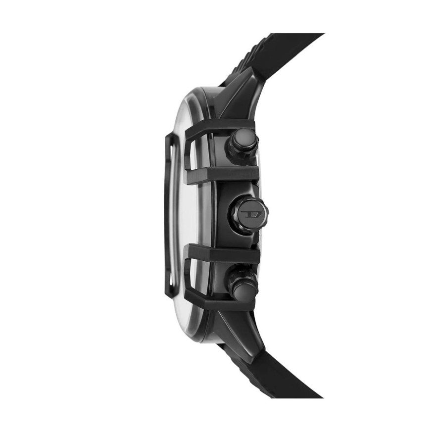 Diesel DZ4650SET от колекция Griffed e мъжки кварцов часовник с черен кръгъл циферблат, черен корпус от неръждаема стомана с широчина 48 mm и черна каишка 20 mm, изработена от силикон.