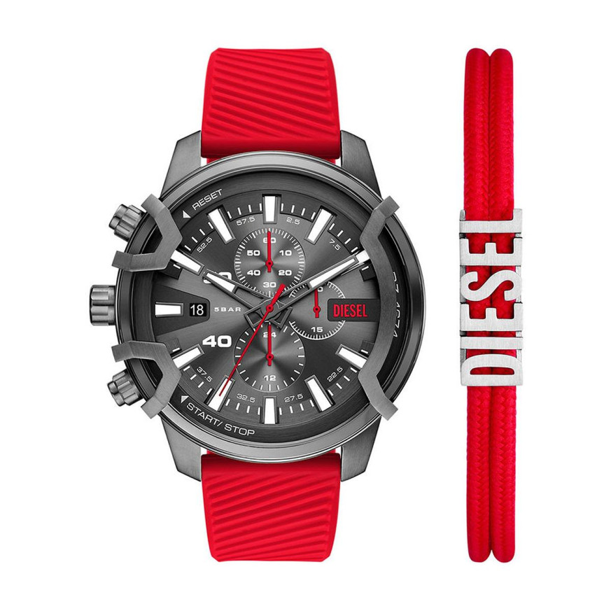 Мъжки Сет Diesel DZ4673SET Diesel DZ4673SET от колекция Griffed e сет от мъжки кварцов часовник и червена найлонова гривна с лого. Часовникът е с черен кръгъл циферблат, gunmetal корпус от неръждаема стомана с диаметър 48 mm и червена каишка 22 mm, изработена от естествена кожа.