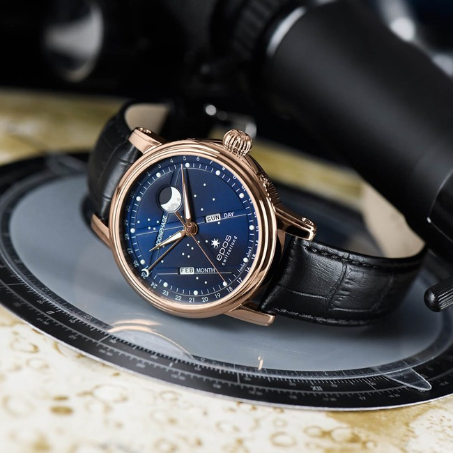 Корпусът от благородна стомана с розово PVD покритие (41.7 мм) придава изтънчен блясък, а голямата луминесцентна луна и звезди придават триизмерна дълбочина.