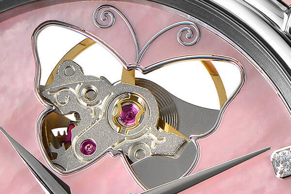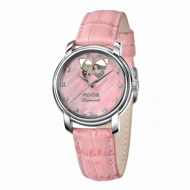 Часовник EPOS 4314.133.20.83.13 е изискан дамски модел, който съчетава швейцарско часовникарско майсторство и бижутерска естетика. Циферблатът от естествен седеф в розов нюанс е декориран с истински диаманти и отличителен отвор във формата на пеперуда, разкриващ баланса на автоматичния механизъм. Полу-скелетонизираният механизъм SW200 подчертава инженерната прецизност, докато корпусът от благородна стомана и кожената каишка в розов цвят придават нежна и елегантна визия. Сапфир-кристалът гарантира устойчивост и яснота, характерни за високия клас швейцарски часовници.