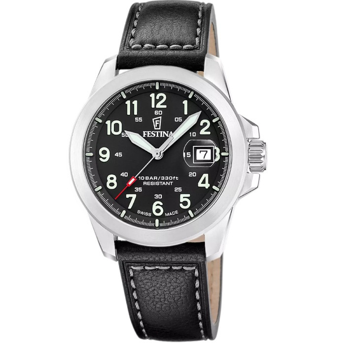 Часовник Festina F20081/4 – Мъжки спортен модел от серията Festina Swiss. Изработен от висококачествена 316L неръждаема стомана с диаметър 42 мм, този часовник е задвижван от швейцарски кварцов механизъм Ronda 715 с функция дата. Черният циферблат с арабски цифри и Super-LumiNova покритие гарантира отлична видимост дори в тъмни условия. Сапфир кристалът осигурява издръжливост, а водоустойчивостта до 10 ATM прави модела надежден избор за активни мъже, търсещи комбинация от швейцарска прецизност и спортен стил.