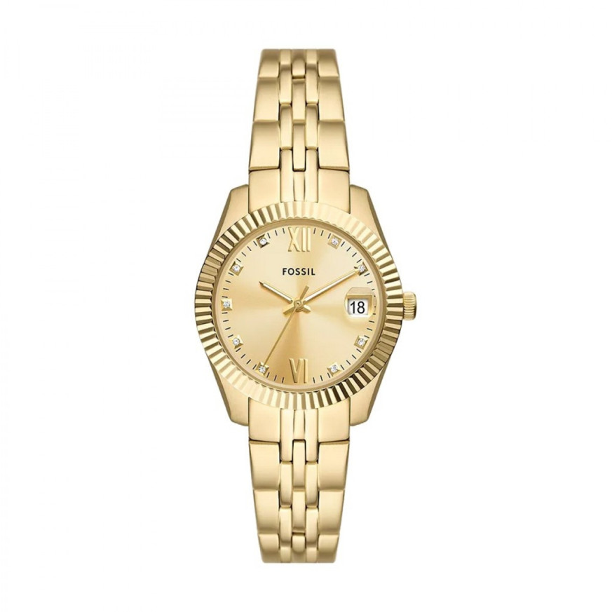 Fossil ES5338 от колекция Scarlette e дамски кварцов часовник със златист кръгъл циферблат, златист корпус от неръждаема стомана с широчина 32 mm и златиста верижка 16 mm, изработена от неръждаема стомана.
