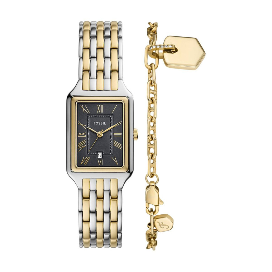Дамски Сет Fossil ES5376SET   Fossil ES5376SET от колекция Raquel e сет от дамски кварцов часовник и златиста гривна от неръждаема стомана. Часовникът е със сив правоъгълен, north-south циферблат, сребрист корпус от неръждаема стомана с диаметър 23 mm и двуцветна верижка 12 mm, изработена от неръждаема стомана.