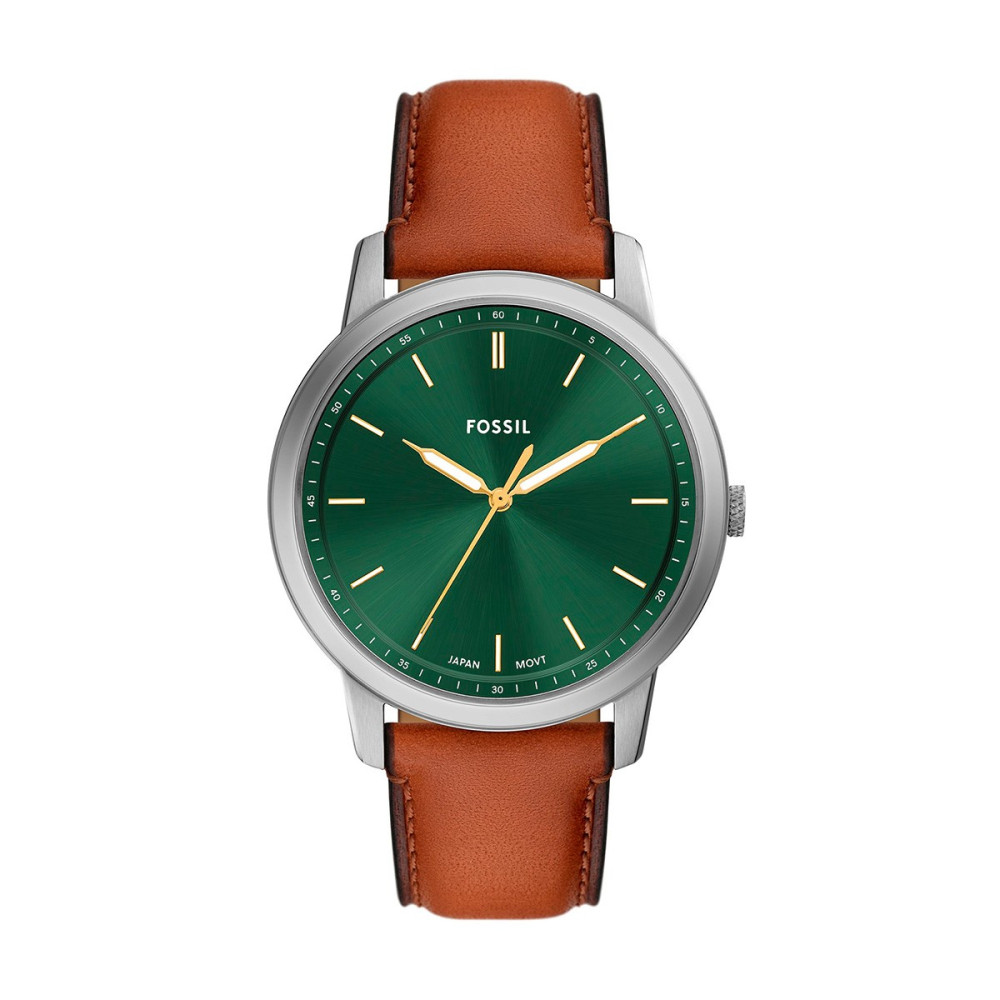 Мъжки Часовник Fossil FS6094   Fossil FS6094 от колекция Minimalist e мъжки кварцов часовник със зелен кръгъл циферблат, сребрист корпус от неръждаема стомана с диаметър 44 mm и кафява каишка 22 mm, изработена от естествена кожа.