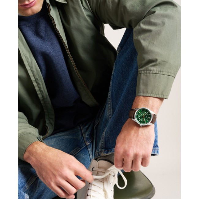 Мъжки Часовник Fossil FS6137 Fossil FS6137 от колекция Pearson e мъжки кварцов часовник със зелен кръгъл циферблат, сребрист корпус от неръждаема стомана с диаметър 42 mm и кафява каишка 22 mm, изработена от естествена кожа.