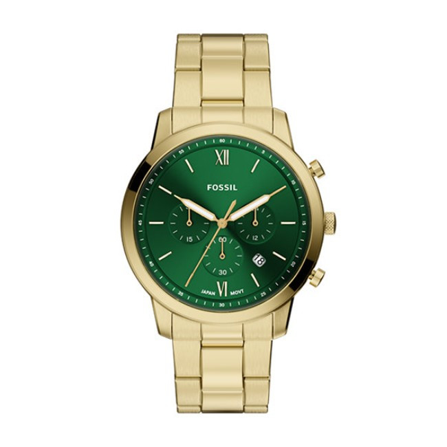 Мъжки Часовник Fossil FS6164   Fossil FS6164 от колекция Neutra e мъжки кварцов часовник със зелен кръгъл циферблат, златист корпус от неръждаема стомана с диаметър 44 mm и златиста верижка 22 mm, изработена от неръждаема стомана.