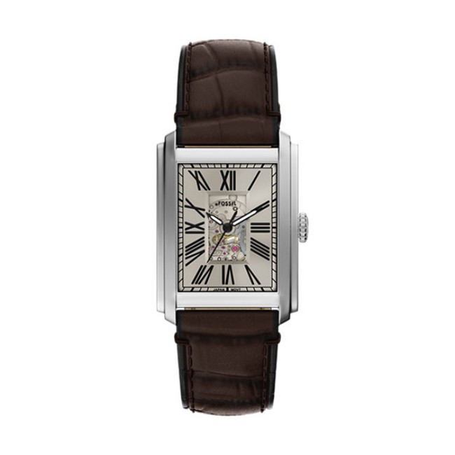 Мъжки Часовник Fossil ME3272   Fossil ME3272 от колекция Carraway e мъжки автоматичен часовник с бежовозлатист правоъгълен, north-south циферблат, сребрист корпус от неръждаема стомана с диаметър 30 mm и кафява каишка 22 mm, изработена от естествена кожа.