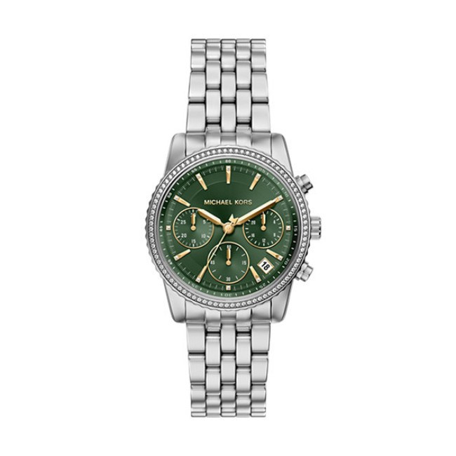 Дамски Часовник Michael Kors MK7583   Michael Kors MK7583 от колекция Bryant e дамски кварцов часовник със зелен кръгъл циферблат, сребрист корпус от неръждаема стомана с диаметър 35 mm и сребриста верижка 18 mm, изработена от неръждаема стомана.