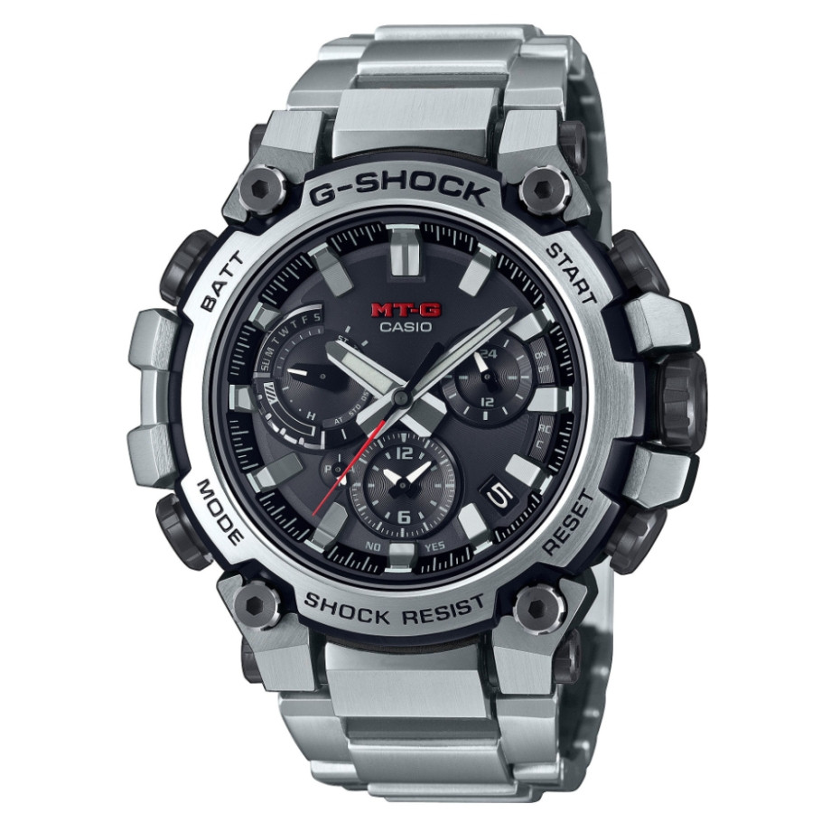 Casio G-Shock MTG-B3000D-1AER е висок клас модел от серията MT-G, произведен в Япония, който съчетава здравина и иновации. С корпус от неръждаема стомана и карбон, сапфирено стъкло и комбинирана верижка, този часовник е създаден за дълготрайна издръжливост. Функциите включват Bluetooth връзка, радио сверяване, соларна батерия, автоматична калибрация на стрелките, Phone Finder, световно време и водоустойчивост до 200 м. Перфектен избор за модерния мъж, който цени прецизност и стил.