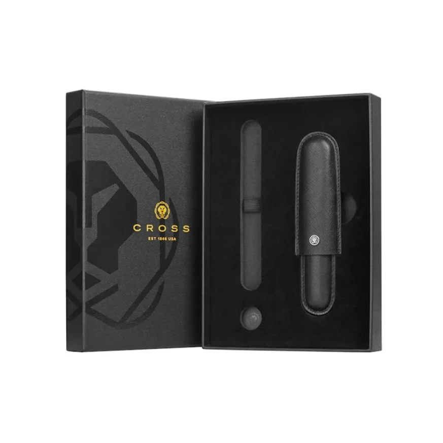 Тази подаръчна кутия на A.T. Cross включва и класически черен кожен калъф в стил "пура" за една писалка от A.T. Cross, който е ценен заради своя уникален дизайн.