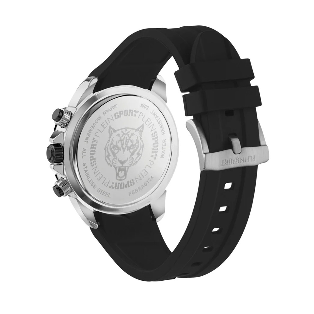 Часовник Philipp Plein PSBEA0124 – мъжки спортен хронограф от колекцията Plein Sport, съчетаващ сила, лукс и функционалност. Черният циферблат със сребристи акценти и три допълнителни скали подчертава динамичния характер на модела. Корпусът от неръждаема стомана и силиконовата каишка осигуряват издръжливост и комфорт, а минерал-кристалното стъкло предпазва от надрасквания. С водоустойчивост до 5 ATM и кварцов механизъм, този модел е идеален избор за активни и стилни мъже.