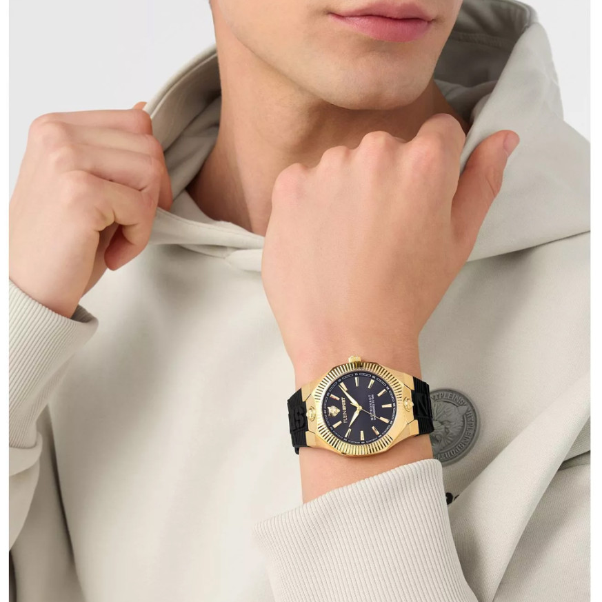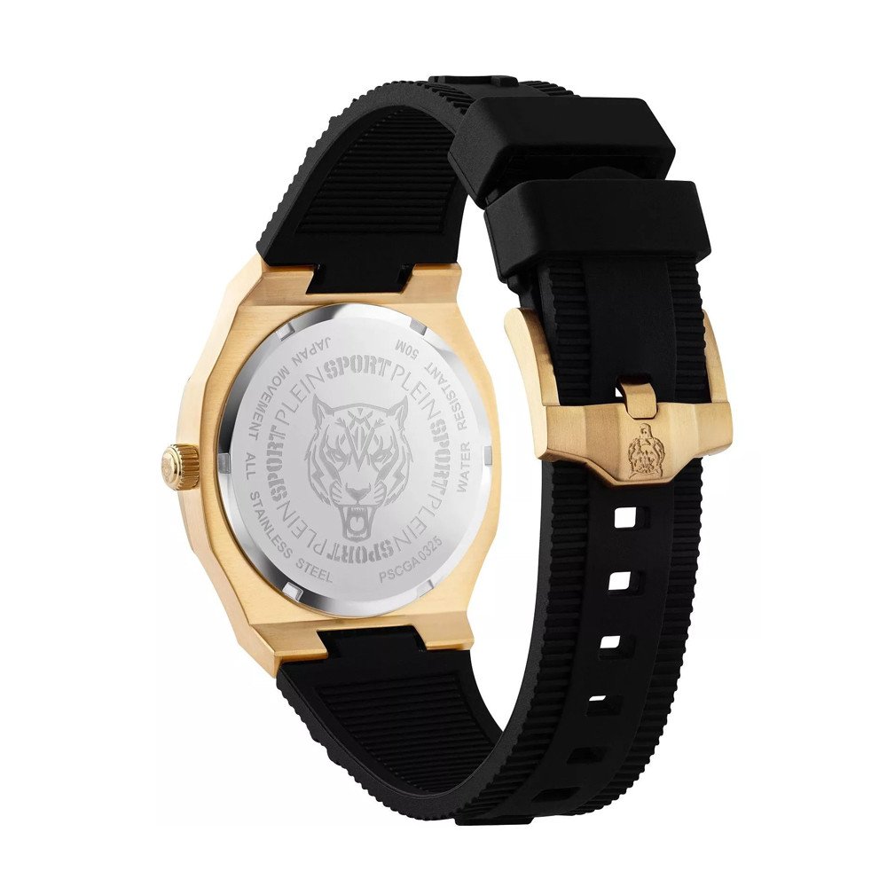 Часовник Philipp Plein PSCGA0325 – стилен мъжки модел от колекцията Plein Sport Metronaut, който впечатлява с луксозен спортен характер и модерна визия. Черният аналогов циферблат със златисти акценти подчертава изисканото присъствие на часовника. Корпусът от неръждаема стомана е комбиниран със силиконова каишка за максимален комфорт. Минерал-кристалното стъкло предпазва от надрасквания, а водоустойчивостта 5 ATM гарантира надеждност при ежедневна употреба.