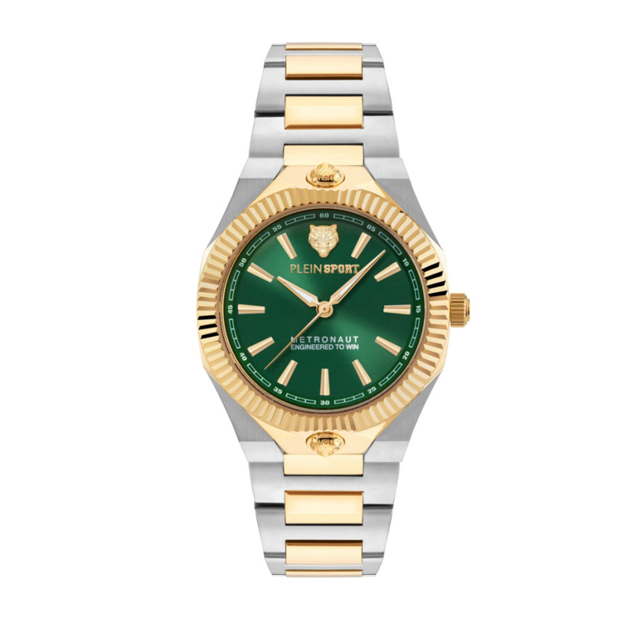 Часовник Philipp Plein PSDGA0525 – впечатляващ дамски модел от колекцията Plein Sport Metronaut, съчетаващ спортна енергия и изискан стил. Зеленият аналогов циферблат с мотив глава на тигър и златисти детайли придава характерна визия и луксозен акцент. Корпусът и верижката от неръждаема стомана гарантират здравина и комфорт, а минерал-кристалното стъкло защитава от надрасквания. Водоустойчивостта до 5 ATM и кварцовият механизъм осигуряват надеждност и практичност при ежедневно носене.