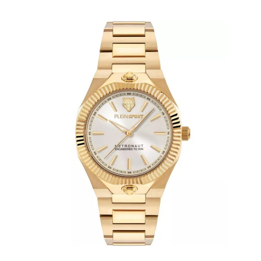 Часовник Philipp Plein PSDGA0625 – дамски модел от колекция Plein Sport Metronaut впечатлява със златист дизайн и характерния мотив с глава на тигър върху циферблата. Корпусът и верижката са изработени от неръждаема стомана, което гарантира здравина и комфорт при носене. Минерал-кристалното стъкло осигурява защита от надраскване, а водоустойчивостта до 5 ATM позволява ежедневна употреба. С кварцов механизъм и елегантно излъчване, този модел е идеален избор за жени, търсещи спортно-елегантен стил със смели детайли.