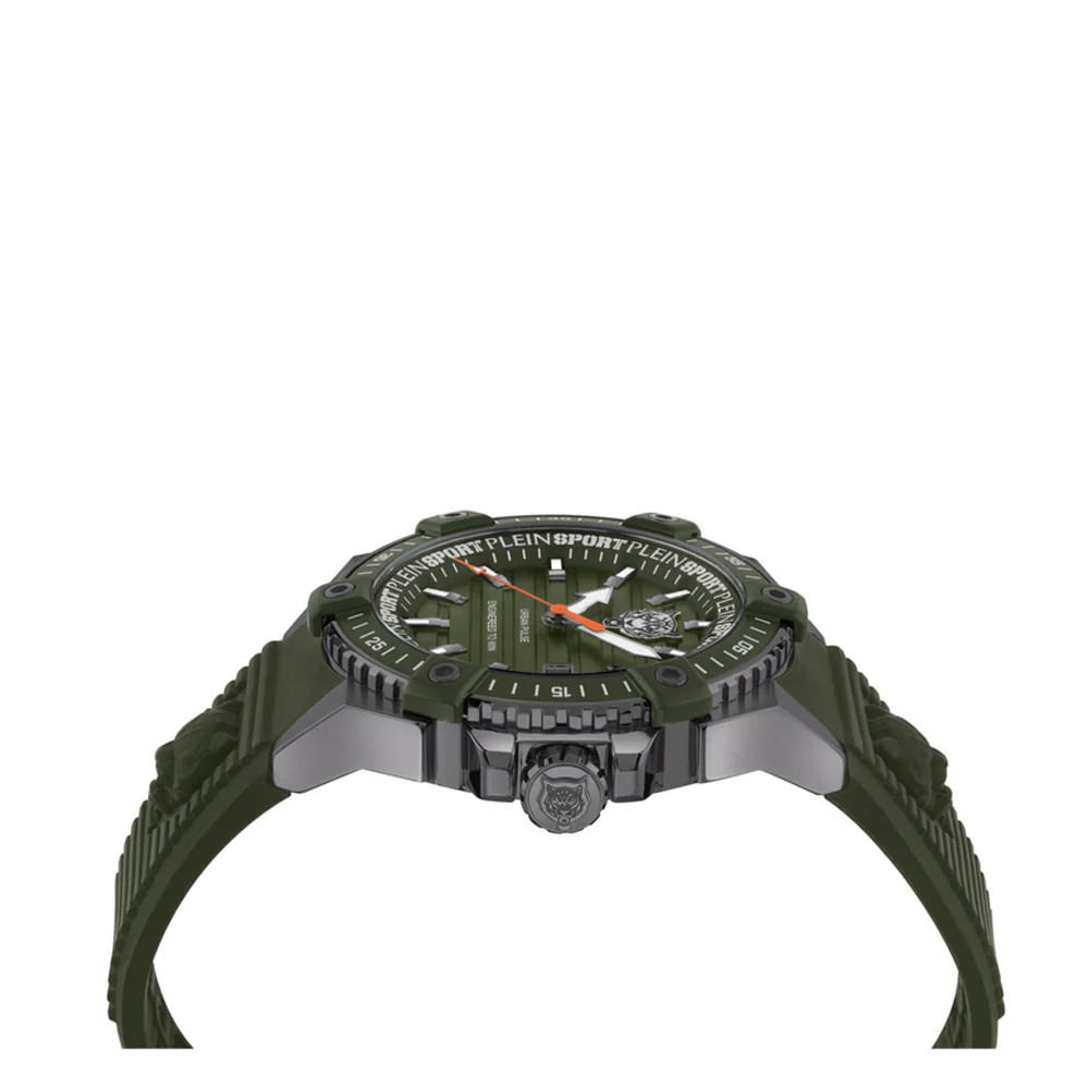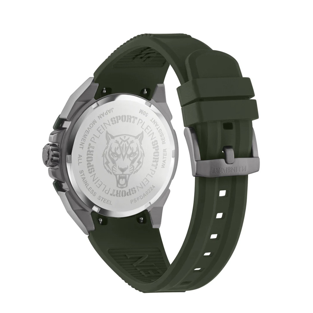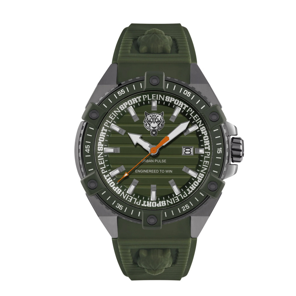 Часовник Philipp Plein PSFDA0224 – впечатляващ мъжки спортен модел от колекцията Plein Sport, съчетаващ сила и елегантност. Тъмнозеленият аналогов циферблат с надпис „Engineered to Win“ и индикация за дата подчертават характерния дух на Philipp Plein. Корпусът от неръждаема стомана и силиконовата каишка с 3D тигрова глава придават отличителен стил и комфорт. Минерал-кристалното стъкло осигурява защита от надраскване, а водоустойчивостта 5 ATM прави часовника идеален за динамичното ежедневие.