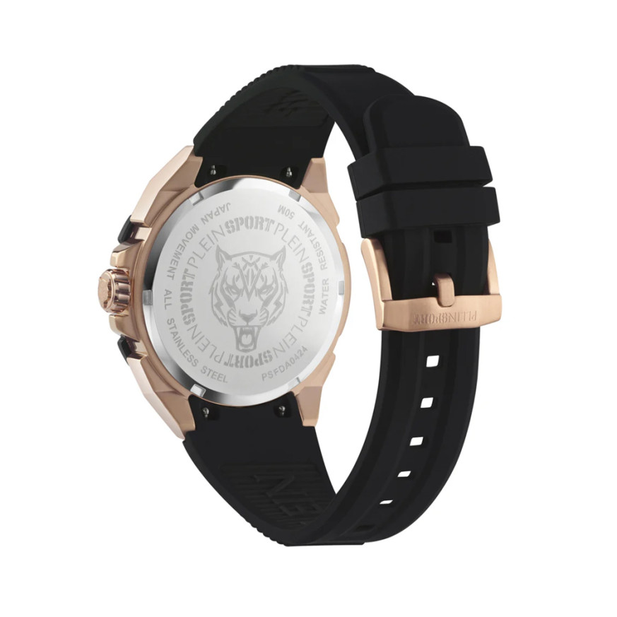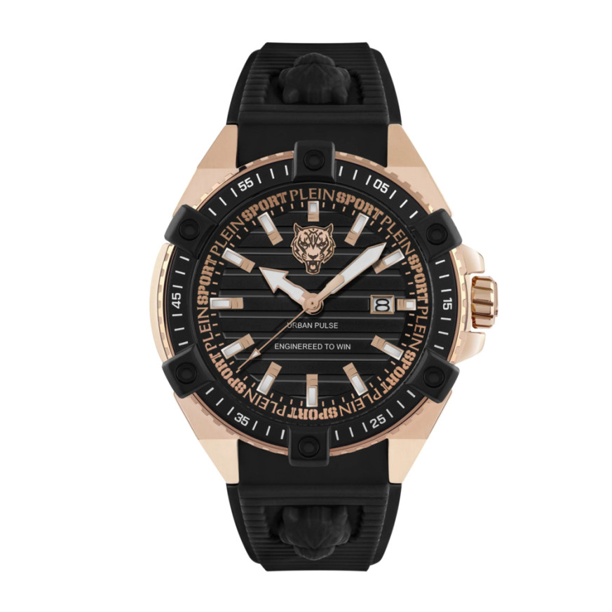 Часовник Philipp Plein PSFDA0424 – модерен мъжки модел с мощно спортно излъчване от колекцията Plein Sport. Черният аналогов циферблат с надпис „Engineered to Win“ и индикация за дата подчертават характерния стил на марката. Корпусът от неръждаема стомана и черната силиконова каишка с 3D тигрова глава осигуряват уникален външен вид и комфорт при носене. Минерал-кристалното стъкло е устойчиво на надрасквания, а водоустойчивостта до 5 ATM прави часовника подходящ за активен начин на живот.