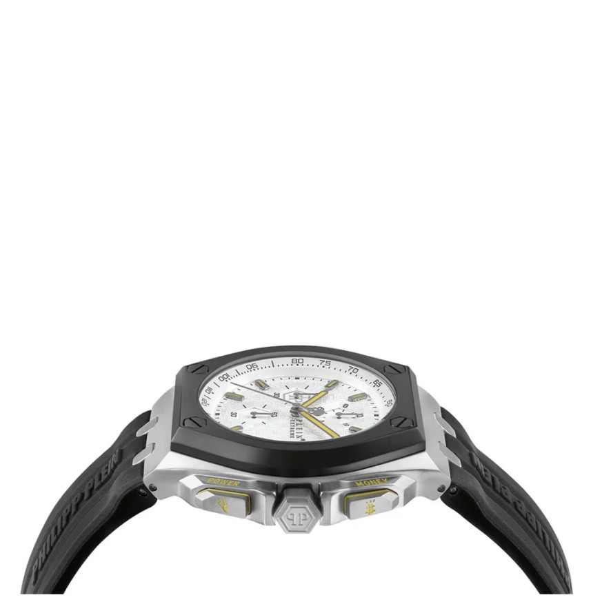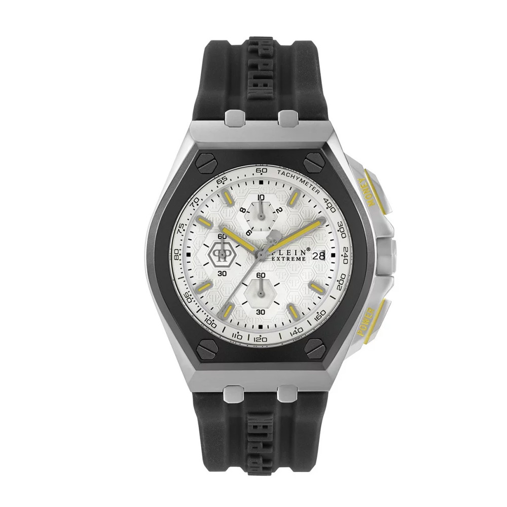 Часовник Philipp Plein PWGAA0121 – мъжки спортно-елегантен хронограф от колекцията Extreme, съчетаващ динамика и изискан стил. Сивият циферблат с хронографски функции и дата подчертава модерен характер и функционалност. Корпусът от неръждаема стомана и силиконовата каишка с логото на марката осигуряват комфорт и издръжливост. Минерал-кристалното стъкло предпазва от надрасквания, а водоустойчивостта до 5 ATM гарантира надеждност при ежедневно носене.