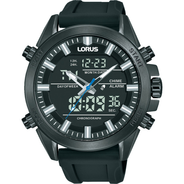 Часовник Lorus RW671AX9 – модерен мъжки спортен модел от колекция Sport, който комбинира аналогова и дигитална технология за максимална практичност. Корпусът е изработен от здрава неръждаема стомана, а черната силиконова каишка гарантира комфорт при носене. Циферблатът с EL подсветка осигурява отлична видимост дори при слаба светлина. Моделът предлага функции като дата, ден, месец, аларма, хронограф и 12/24-часов формат. Водоустойчив до 10 ATM, този часовник е идеален както за ежедневие, така и за спортни и водни активности.