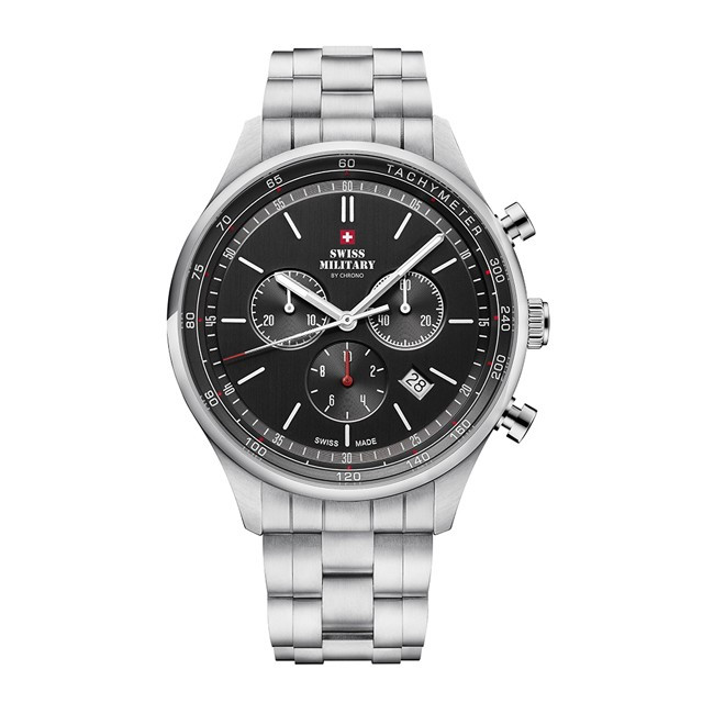 Мъжки Часовник Swiss Military By Chrono SM34081.01 Swiss Military By Chrono SM34081.01 от колекция SM34081 e мъжки швейцарски автоматичен часовник с черен циферблат с индекси, стъкло минерал със сапфирено покритие , сребрист  корпус от неръждаема стомана  с диаметър 42 mm и сребриста  верижка, изработена от неръждаема стомана. Моделът е с 10 ATM водоустойчивост и механизъм Ronda 5040.D с функции Хронограф. Всички часовници Swiss Military By Chrono са с 5 години гаранция.