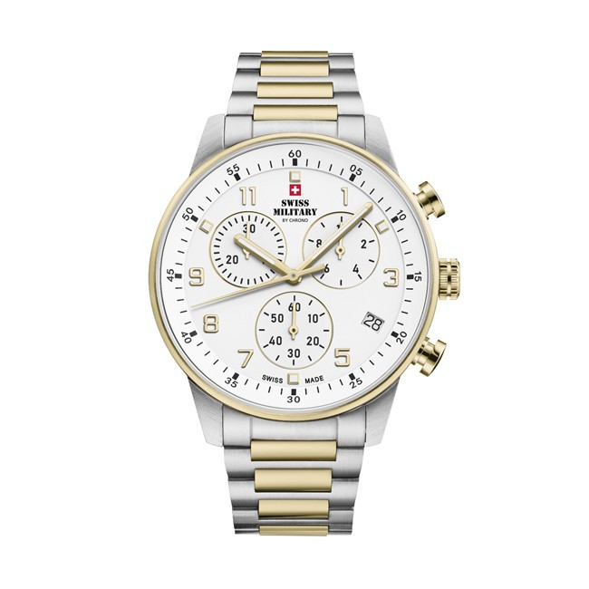 Мъжки Часовник Swiss Military By Chrono SM34114.04 Swiss Military By Chrono SM34114.04 от колекция SM34114 e мъжки швейцарски автоматичен часовник с бял циферблат с арабски числа, стъкло сапфир кристал, двуцветен  корпус от неръждаема стомана  с диаметър 41 mm и двуцветна  верижка, изработена от неръждаема стомана. Моделът е с 10 ATM водоустойчивост и механизъм ETA G10.212 с функции Хронограф. Всички часовници Swiss Military By Chrono са с 5 години гаранция.