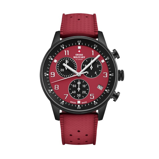 Мъжки Часовник Swiss Military By Chrono SM34114.14 Swiss Military By Chrono SM34114.14 от колекция SM34114 e мъжки швейцарски автоматичен часовник с червен циферблат с арабски числа, стъкло сапфир кристал, черен  корпус от неръждаема стомана  с диаметър 41 mm и червена каишка, изработена от силикон. Моделът е с 10 ATM водоустойчивост и механизъм ETA G10.212 с функции Хронограф. Всички часовници Swiss Military By Chrono са с 5 години гаранция.