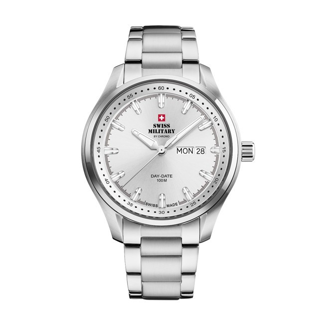 Мъжки Часовник Swiss Military By Chrono SM34116.02 Swiss Military By Chrono SM34116.02 от колекция SM34116 e мъжки швейцарски автоматичен часовник със сребрист циферблат с индекси, стъкло сапфир кристал, сребрист  корпус от неръждаема стомана  с диаметър 42 mm и сребриста  верижка, изработена от неръждаема стомана. Моделът е с 10 ATM водоустойчивост и механизъм Ronda 517 Day/Date с функции Час, Минути, Секунди. Всички часовници Swiss Military By Chrono са с 5 години гаранция.