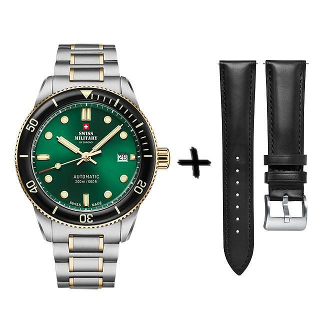 Мъжки Сет Swiss Military By Chrono SMA34106.03SET   Swiss Military By Chrono SMA34106.03SET от колекция SMA34106 е сет от швейцарски автоматичен часовник черна кожена каишка. Часовникът е с двуцветен корпус от неръждаема стомана,двуцветна верижка от неръждаема стомана и зелен циферблат. Всички часовници Swiss Military By Chrono са с 5 години гаранция.