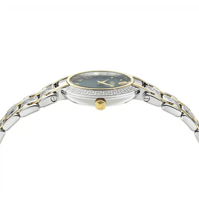 Часовник Versace VE0P00425 Antlia е въплъщение на италианския лукс и швейцарската прецизност. Дизайнът му впечатлява с зелен циферблат, обрамчен от гръцкия мотив (Meander) по безела, символ на вечния стил на марката. Двуцветната верижка и златното IP покритие подчертават елегантността на модела, докато сапфир кристалът и швейцарският кварцов механизъм гарантират дълготрайност и точност. С диаметър 34 мм и водоустойчивост до 3 ATM, този часовник е идеален аксесоар за дами, които ценят лукса, финеса и изисканата визия.