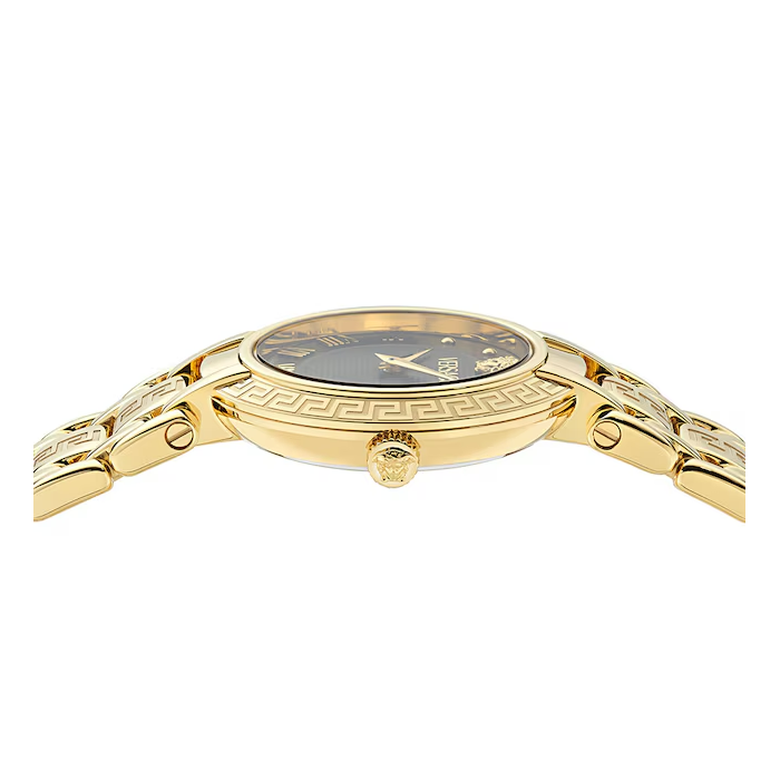 Часовник Versace VE0P00625 Antlia е израз на неподражаемия стил и италиански лукс на марката. Корпусът с жълто златно IP покритие и гравиран гръцки мотив (Meander) по безела излъчват изтънченост и престиж. Черният циферблат с римски цифри и индекси подчертава класическия характер на модела, а сапфир кристалът и швейцарският кварцов механизъм гарантират прецизност и надеждност. С диаметър 34 мм и водоустойчивост до 3 ATM, този часовник е идеален избор за жени, които търсят изискан баланс между елегантност и функционалност.