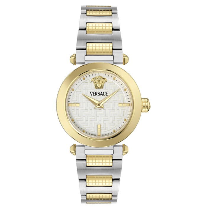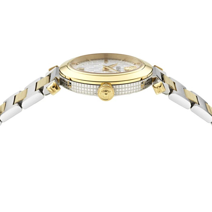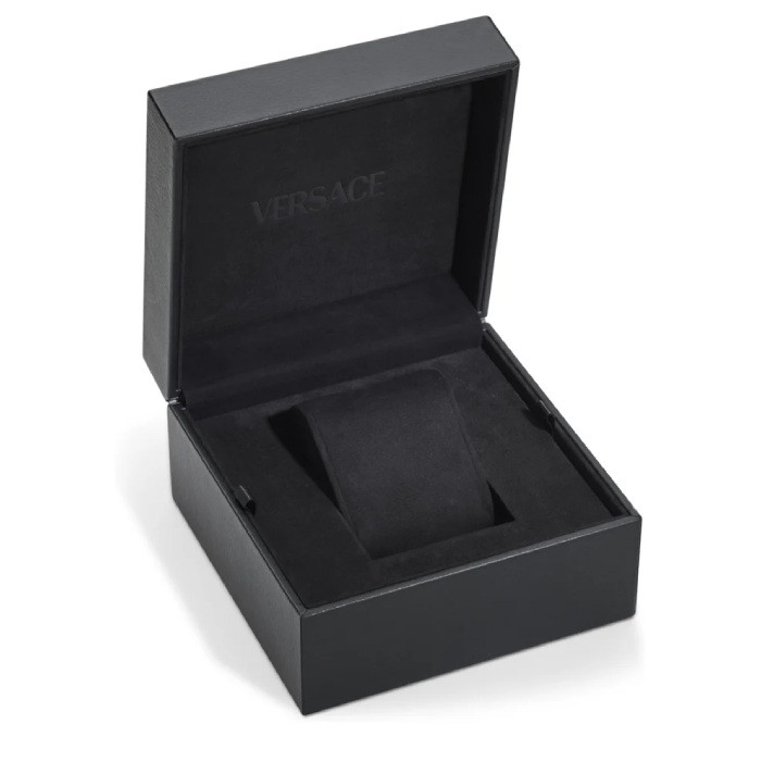 Часовник Versace VE5B00325 V-Galaxy съчетава неподражаем италиански стил с швейцарска прецизност. Черният циферблат с функция Лунна фаза, златисти индекси и детайли придава усещане за изтънченост и космически чар. Корпусът със златно IP покритие и силиконовата каишка осигуряват комфорт и модерен блясък. Защитен със сапфир кристал и оборудван с швейцарския механизъм Ronda 706B.1, този часовник е перфектният избор за дамите, които ценят лукса, точността и индивидуалния стил.