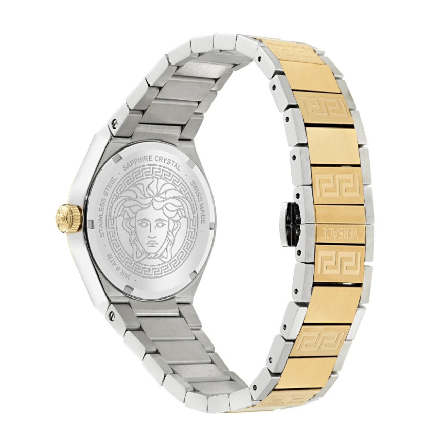 Versace VE5E00426 V-Auria е изискан дамски часовник, който комбинира отличителния стил на Versace с елегантна и балансирана визия. Сребристият циферблат създава светлина и чистота, подчертан от емблематичния Greca мотив и символа Medusa – знаци на лукс и идентичност. Биколорната верижка добавя стилен контраст, правейки модела лесен за комбиниране както със златни, така и със сребърни аксесоари. Това е часовник, който излъчва класа без излишна показност.