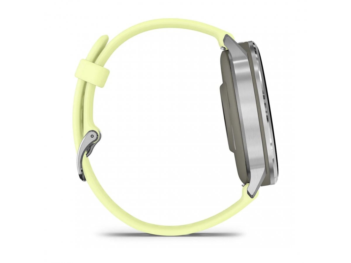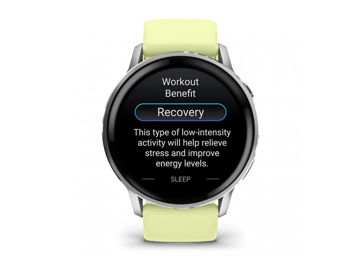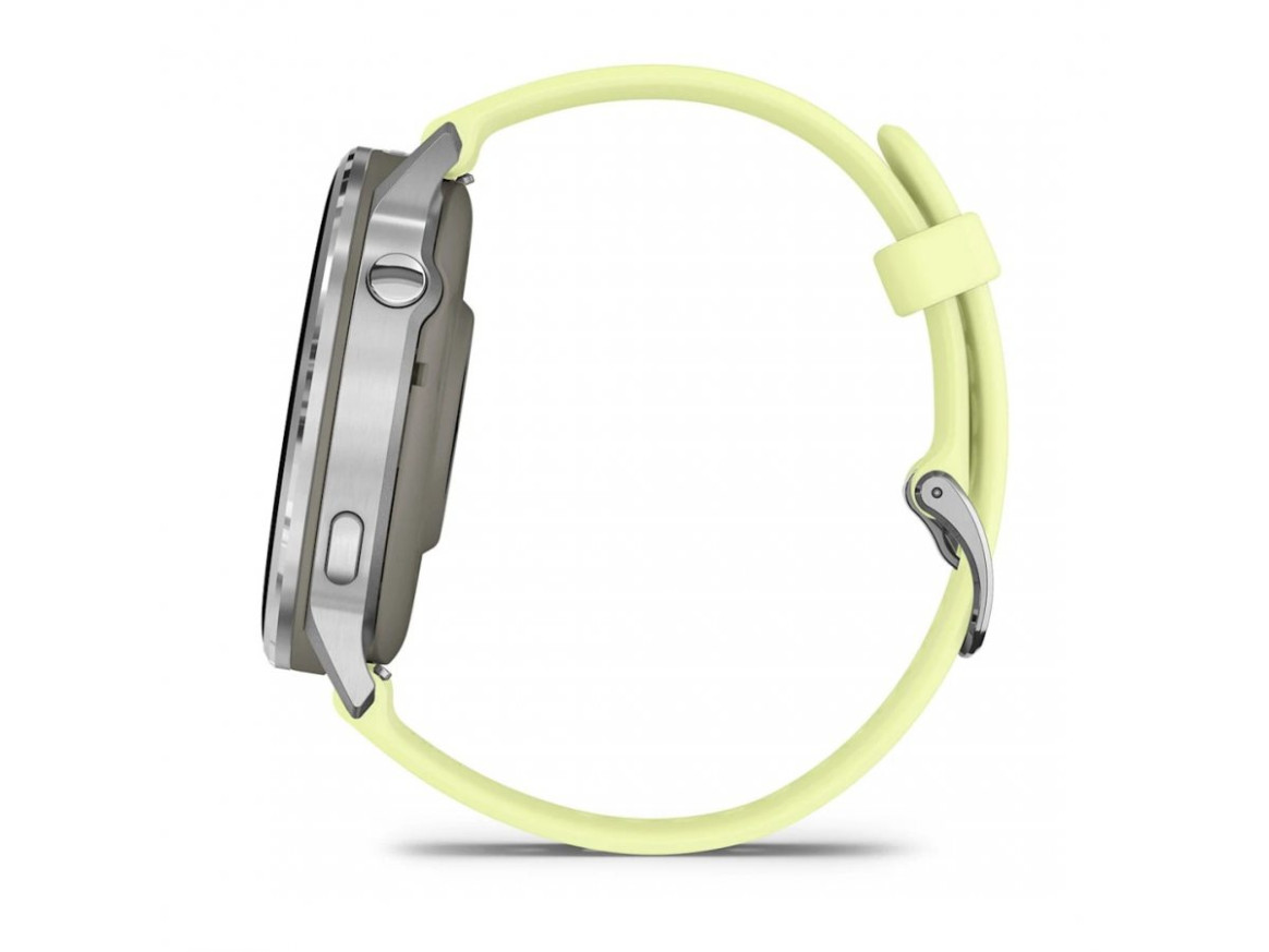 Garmin Venu 4 45mm Silver/Silver Citron е GPS смарт часовник с 1,4” AMOLED дисплей и до 12 дни живот на батерията. Осигурява 24/7 мониторинг на здравето с Body Battery™, Pulse Ox, HRV, мониторинг на съня и женско здраве. Предлага над 80 спортни профила, Garmin Coach, анимирани тренировки, LED фенер, смарт известия и Garmin Pay. Подходящ е за активен живот, фитнес и ежедневие, като комбинира стилен дизайн с изключителна функционалност за спорт и здраве.