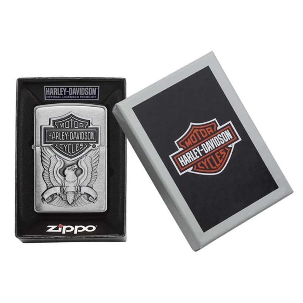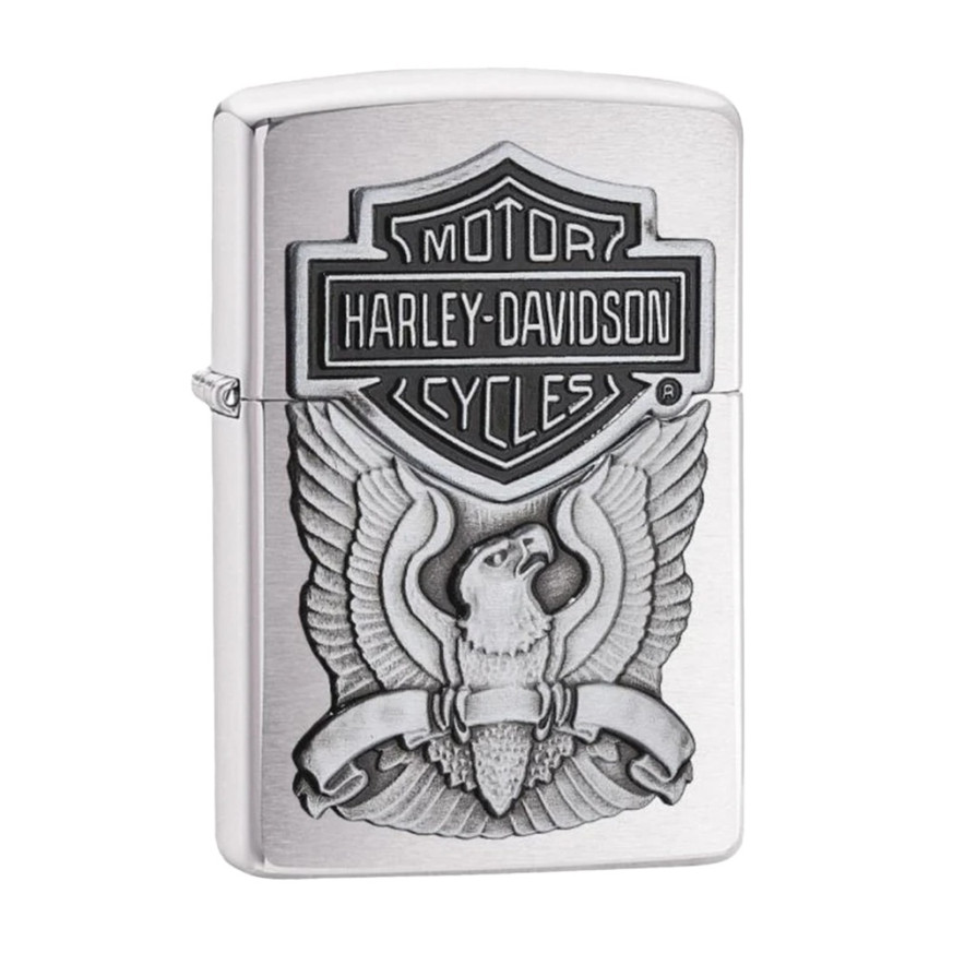 Тази Brushed Chrome запалка има емблема на Harley-Davidson. Предлага се в подаръчна кутия. За оптимална работа, използвайте само оригинален бензин Zippo.