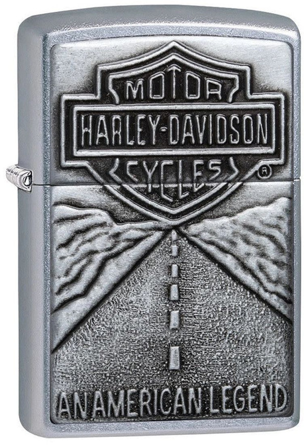 Тази запалка е с класическото лого на Harley-Davidson с лента и щит, характерни за запалка Street Chrome. Към запалката е прикрепена сребърна емблема с надпис „An American Legend“, за да се отдаде почит на производителите на мотоциклети. Предлага се в подаръчна кутия. За оптимална работа, използвайте само оригинален бензин Zippo.