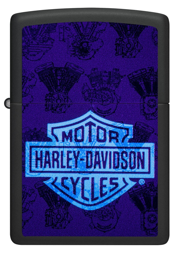 Еволюцията на двигателите се появява в сложни детайли на тази класическа черна матова запалка, a eмблематичното лого на Harley-Davidson се разкрива само в присъствието на ултравиолетова светлина благодарение на специалния процес Black Light. Предлага се опакован в подаръчна кутия.