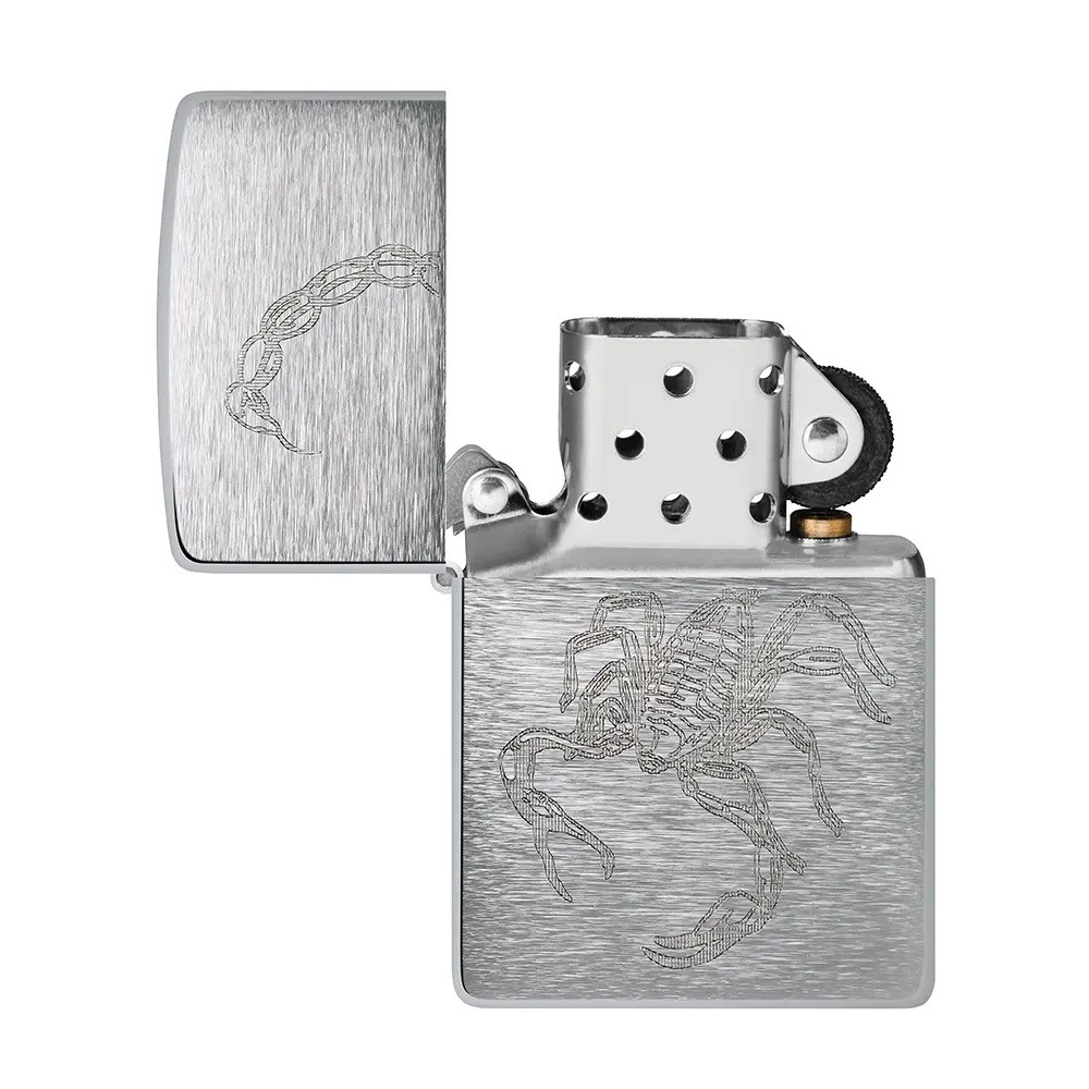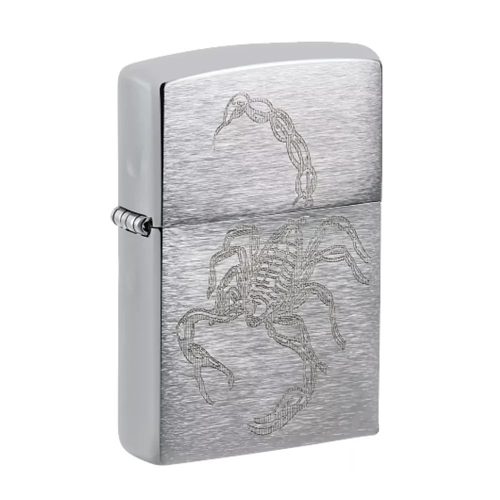 Сребриста запалка Classic Brushed Chrome с дизайн с лазерно гравиран скорпион. Предлага се в подаръчна кутия. За оптимална работа, използвайте само оригинален бензин Zippo.
