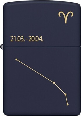 Запалката Zippo Zodiac е уникален продукт, който съчетава функционалност, издръжливост и астрологична символика. Моделът се отличава с елегантна матова основа в тъмносиньо, фино гравирана със златен мотив на астрологичния символ на зодия Овен и съответното ѝ съзвездие, което я прави идеален подарък за родените под този знак. Златният цвят контрастира красиво с тъмния фон, създавайки модерен, но вечен дизайн, а висококачествената изработка прави запалката не само естетически приятна, но и изключително издръжлива.