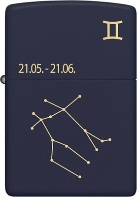 Запалката Zippo Zodiac е уникален продукт, който съчетава функционалност, издръжливост и астрологична символика. Моделът се отличава с елегантна матова основа в тъмносиньо, фино гравирана със златен мотив на астрологичния символ на зодия Близнаци и съответното ѝ съзвездие, което я прави идеален подарък за родените под този знак. Златният цвят контрастира красиво с тъмния фон, създавайки модерен, но вечен дизайн, а висококачествената изработка прави запалката не само естетически приятна, но и изключително издръжлива.
