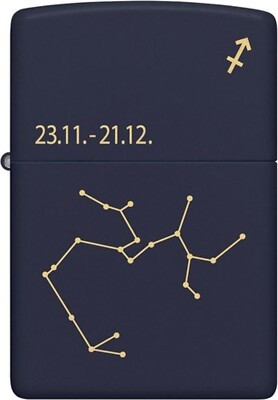 Запалката Zippo Zodiac е уникален продукт, който съчетава функционалност, издръжливост и астрологична символика. Моделът се отличава с елегантна матова основа в тъмносиньо, фино гравирана със златен мотив на астрологичния символ на зодия Стрелец и съответното ѝ съзвездие, което я прави идеален подарък за родените под този знак. Златният цвят контрастира красиво с тъмния фон, създавайки модерен, но вечен дизайн, а висококачествената изработка прави запалката не само естетически приятна, но и изключително издръжлива.